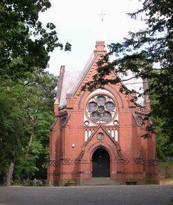Ta niezwykle zdobna w detale architektoniczne budowla zbudowana została w latach 1907 – 1911 i zachowała się do dziś w niezmienionym stanie. Kaplica ma plan ośmioboku z trójbocznym prezbiterium wschodnim i czworobocznym westybulem zachodnim i jest oszkarpowana w sumie aż dwunastoma przyporami. Do jej budowy użyto pełnej czerwonej cegły, a zwłaszcza bardzo dużo cegły glazurowanej o barwach wpadających w brązy i zielenie. Na uwagę zasługują bogato dekorowane szczyty, zmyślne blendy i fryzy oraz różnorodne witrażowe okna zdobione laskowaniami i maswerkami. Całość zadaszona jest ostrosłupowym dachem zwieńczonym metalowym krzyżem. Do wnętrza prowadzą drzwi umieszczone w ostrołukowym ceglanym portalu na ozdobnych pasowych zawiasach, posadzka wykonana została z barwnej terakoty. Ściany kaplicy zdobione są współczesnymi malowidłami o tematyce „memento mori”, w prezbiterium zachował się ceramiczny, neogotycki ołtarz. Kaplica jest wykorzystywana współcześnie, wymaga jednak już pewnych prac renowacyjnych.